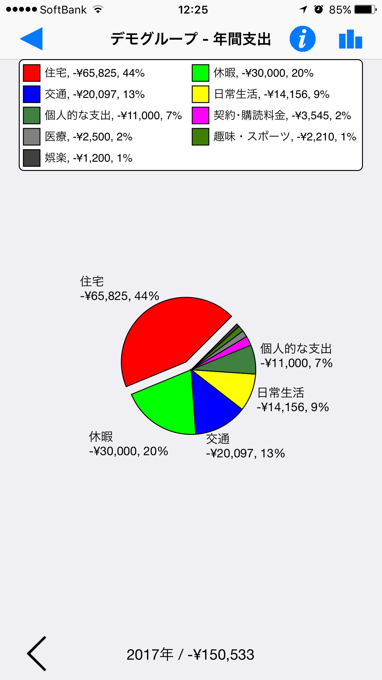 月間/年間の支出内訳、収入内訳、両方合わせた内訳を円グラフで表示されます。