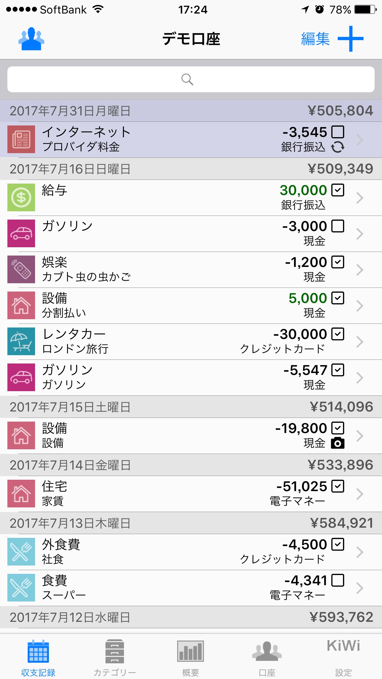 カテゴリーは、大分類として「資金移動」、「収入」、「支出」があり、その中に更に細かいカテゴリーが標準で表示されます。