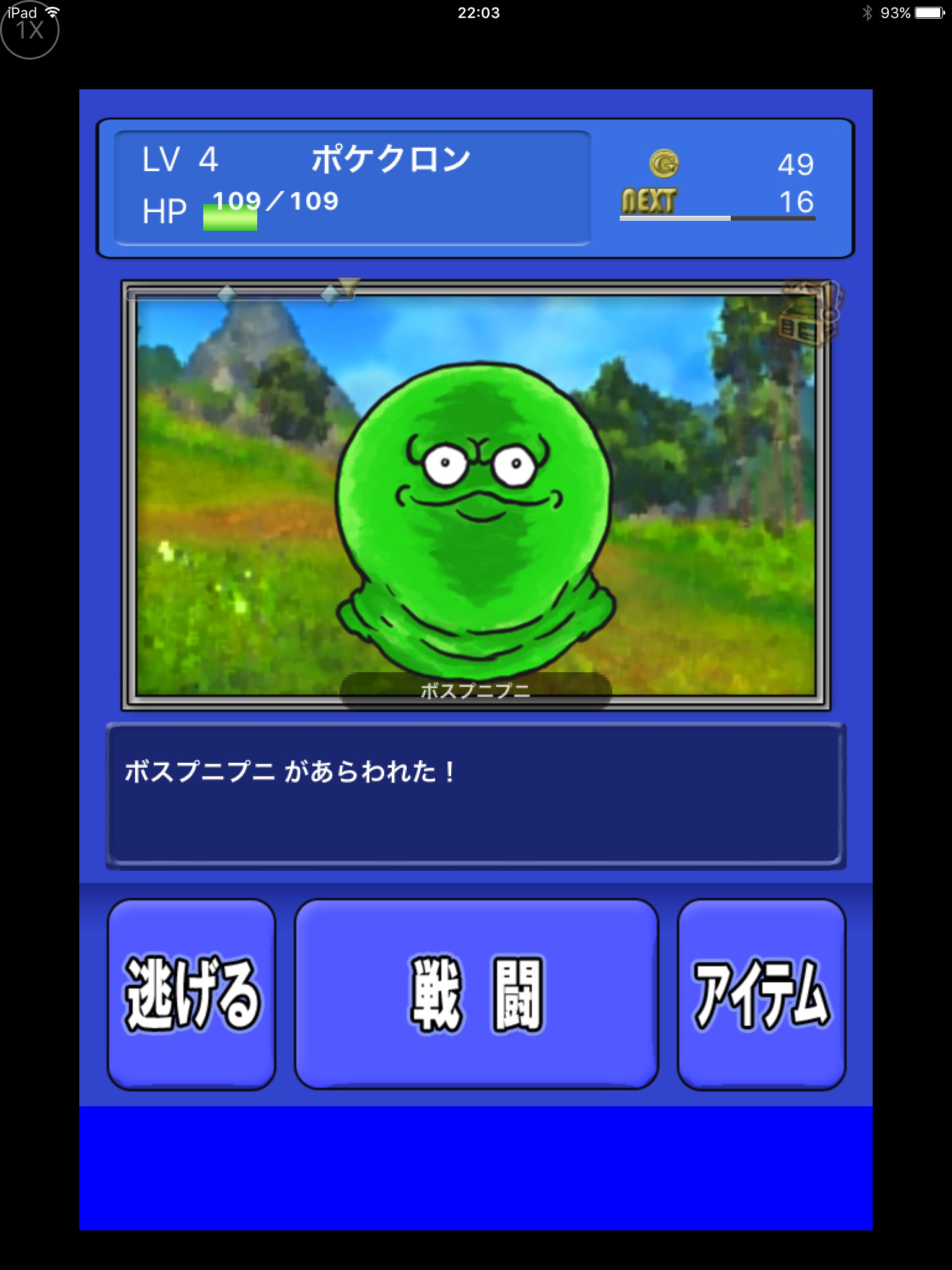 敵に遭遇するとバトルの始まりです。コマンドは戦う・アイテム・逃げるを選べます。敵が強ければ逃げても良いですが失敗することもあるため、なるべくなら倒してしまいましょう。