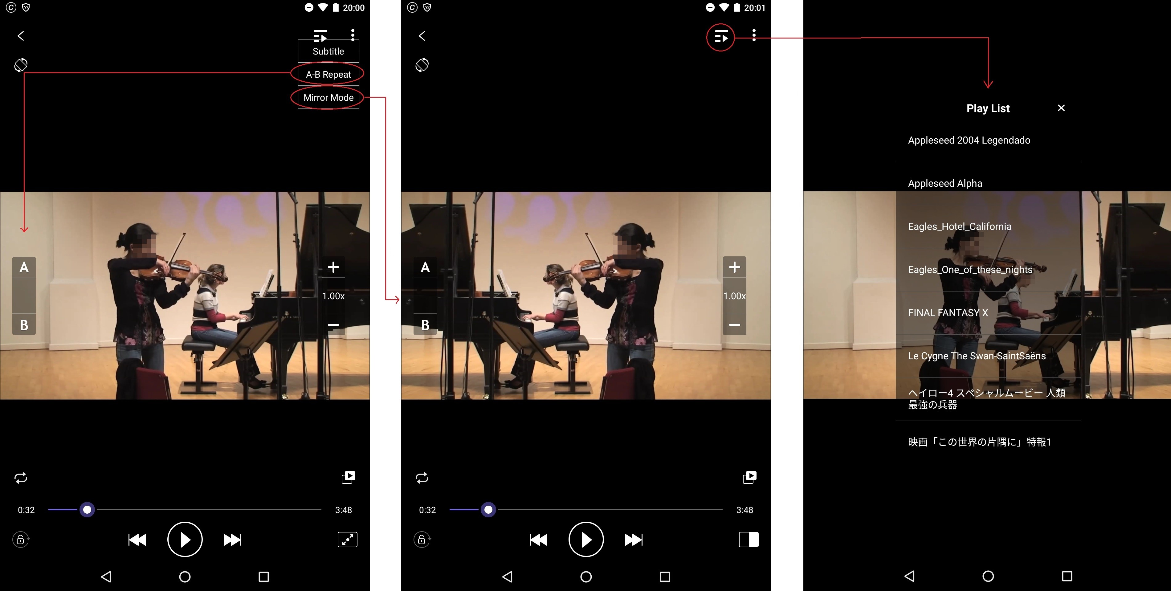 付加機能として字幕設定・リピート・区間リピート・画面反転・画面サイズ変更と、音楽ファイルの再生機能があります。