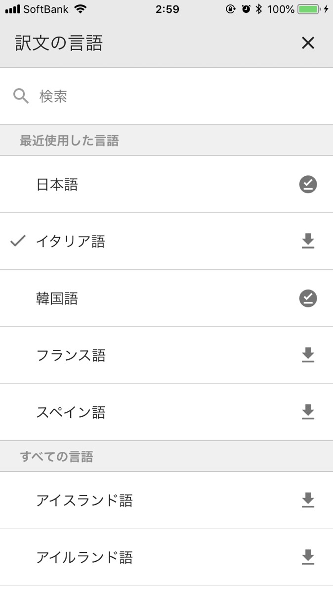 Google翻訳アプリを起動すると、オフライン翻訳のファイルをダウンロードするか尋ねる画面が出るので、必要な言語を選んでダウンロードします。これで、インターネットの環境のない場所でも翻訳することが可能になりました。