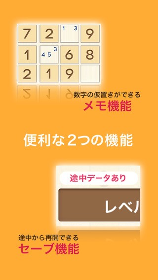 また、淡いオレンジ色を使っているので目にも優しく難問か連続でプレイしても目が疲れにくいです。もちろん、長時間遊び続けるのはやめたほうがいいかもしれませんが、1問めの優しいナンプレからどんどんレベルアップしていくので前半はサクサクと、後半はじっくり1問ずつといった遊び方をするのもおすすめです。