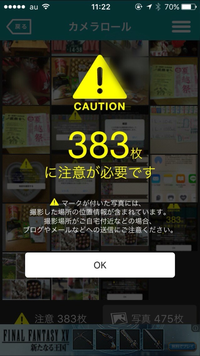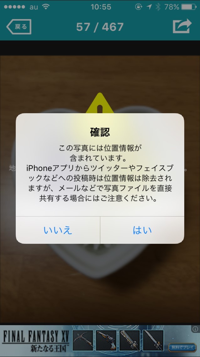 5.位置情報を含む写真が警告マークで表示されるので、その写真の中から1枚選択する