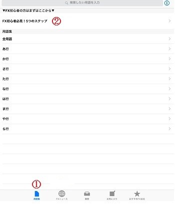 メイン画面の①「用語集」ボタンをタップすると次の画面が表示されます。