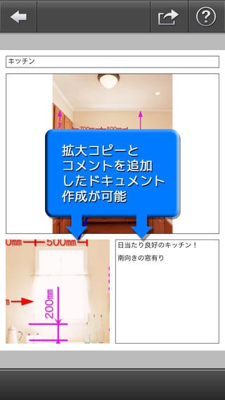 「DimensionX」(有料120円)は、写真に寸法、面積、角度などを書き込み、”Evernote”(共有ノート、メモとして使える人気のビジネスアプリ)