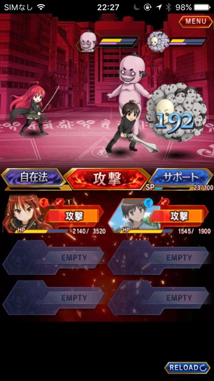 灼眼のシャナ でのバトル操作方法は、画面中央にある攻撃のボタンをタップすればキャラたちが攻撃をしてくれます。自分の攻撃が終わると相手側の攻撃となります。自分の促成と相性の良い敵を狙うと戦いを有利に進めることができますよ。敵の上に出ている黄色いバーがHPゲージとなっていて、その下にある紫のゲージが怒りゲージとなっています。紫の怒りゲージがMAXになると強力な攻撃を仕掛けてくるので注意しましょう。「SP」と書いてある青いゲージはサポートスキルを使うのに必要です。SPではバトル中に受けたダメージを回復させることができます。