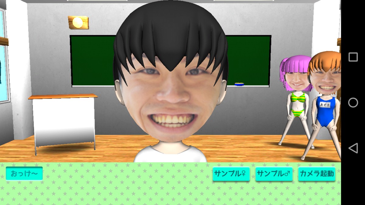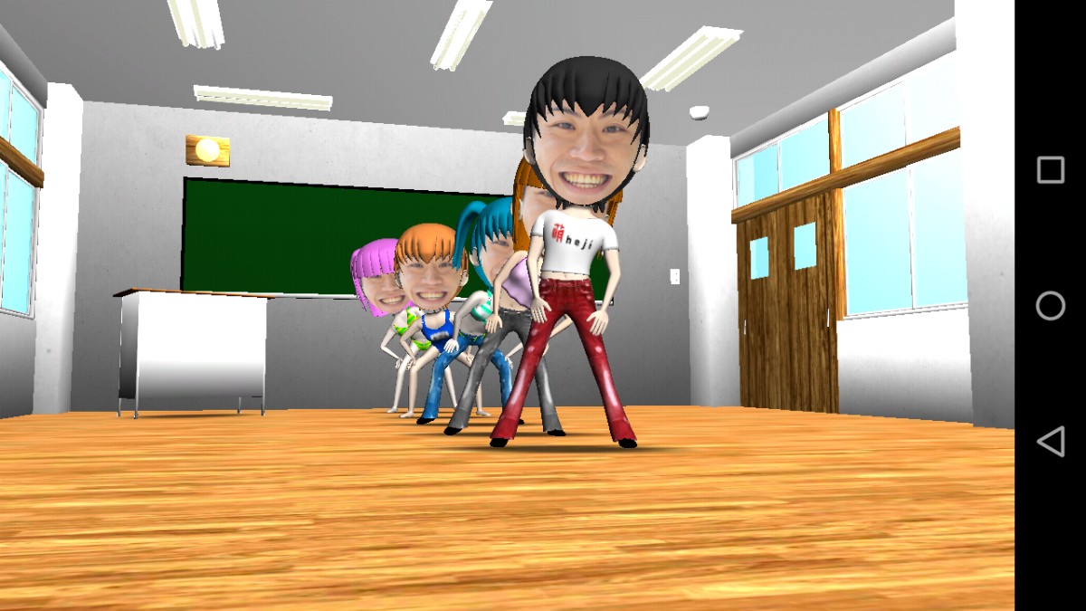 顔ハメ写真されたコミカルなキャラが音楽にのってぐるぐると回り始めます。ダンスの場所は教室の設定で、踊るキャラクターの衣装は、ピタッとした萌えTシャツや、なぜか水着姿だったり、スクール水着だったり。キャラクターは5人いるので、写真は5人まで撮れますが、全部同じ顔にしてしまっても気持ち悪くて笑えます。