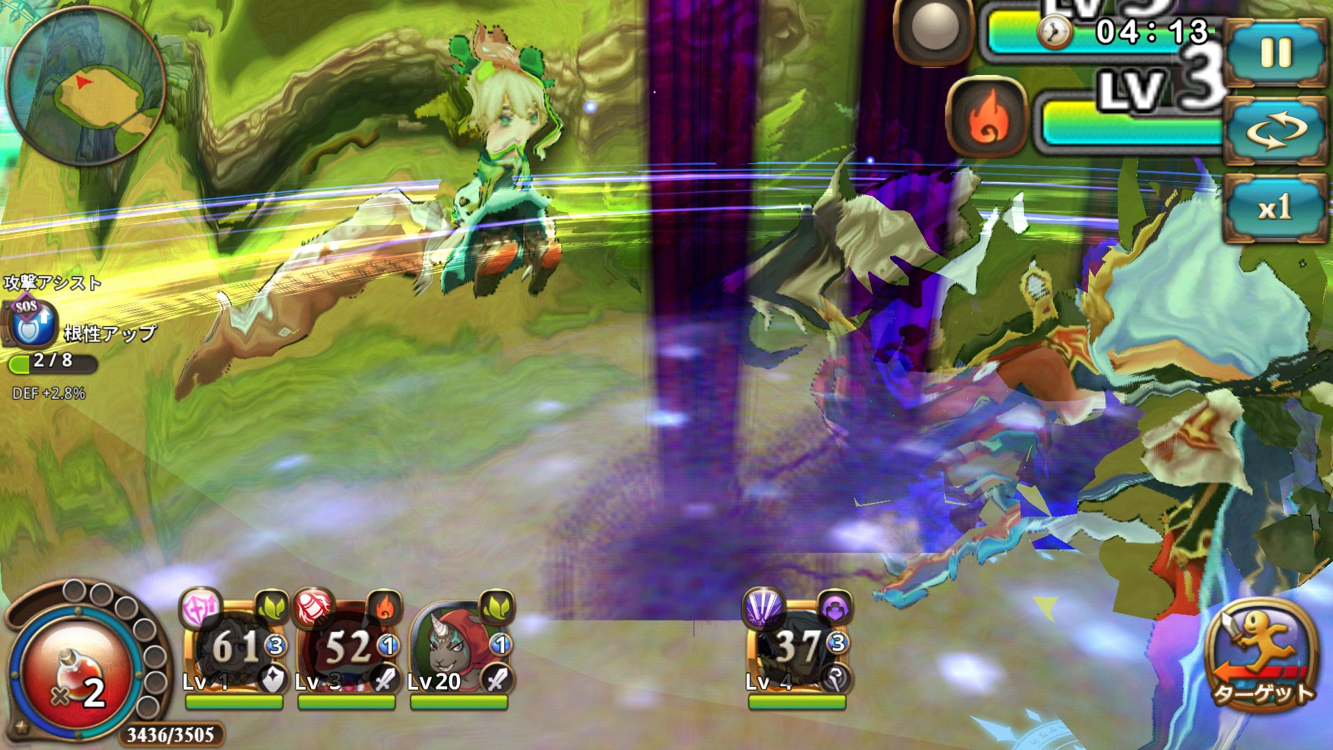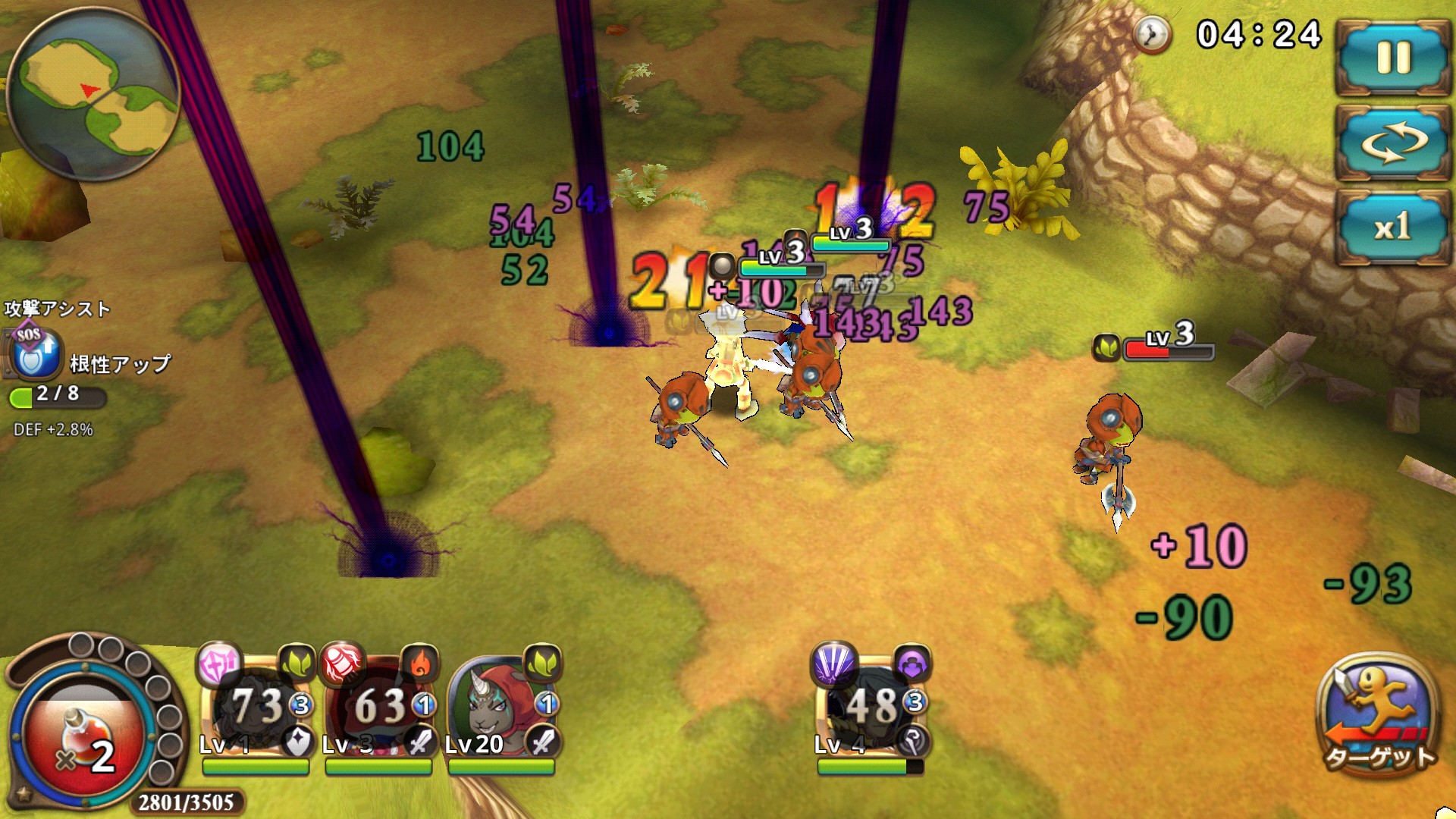 未強化状態だと勝ちづらくなります。画面をタップしての移動が面倒な方は右下にあるターゲットボタンを押すことで、近くにいる敵のところまで自動移動します。