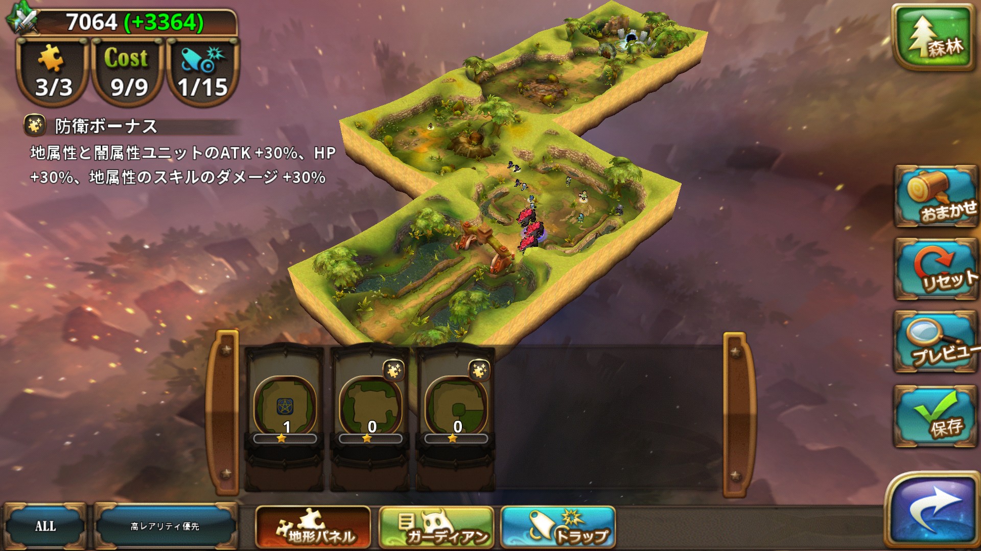 少しゲームを進めると自分の島をカスタムできるようになります。地塊パネルをおき、ガーディアンや防衛施設を配置して他サモナーからの侵攻に備えましょう。いくつかの島に分かれていて、