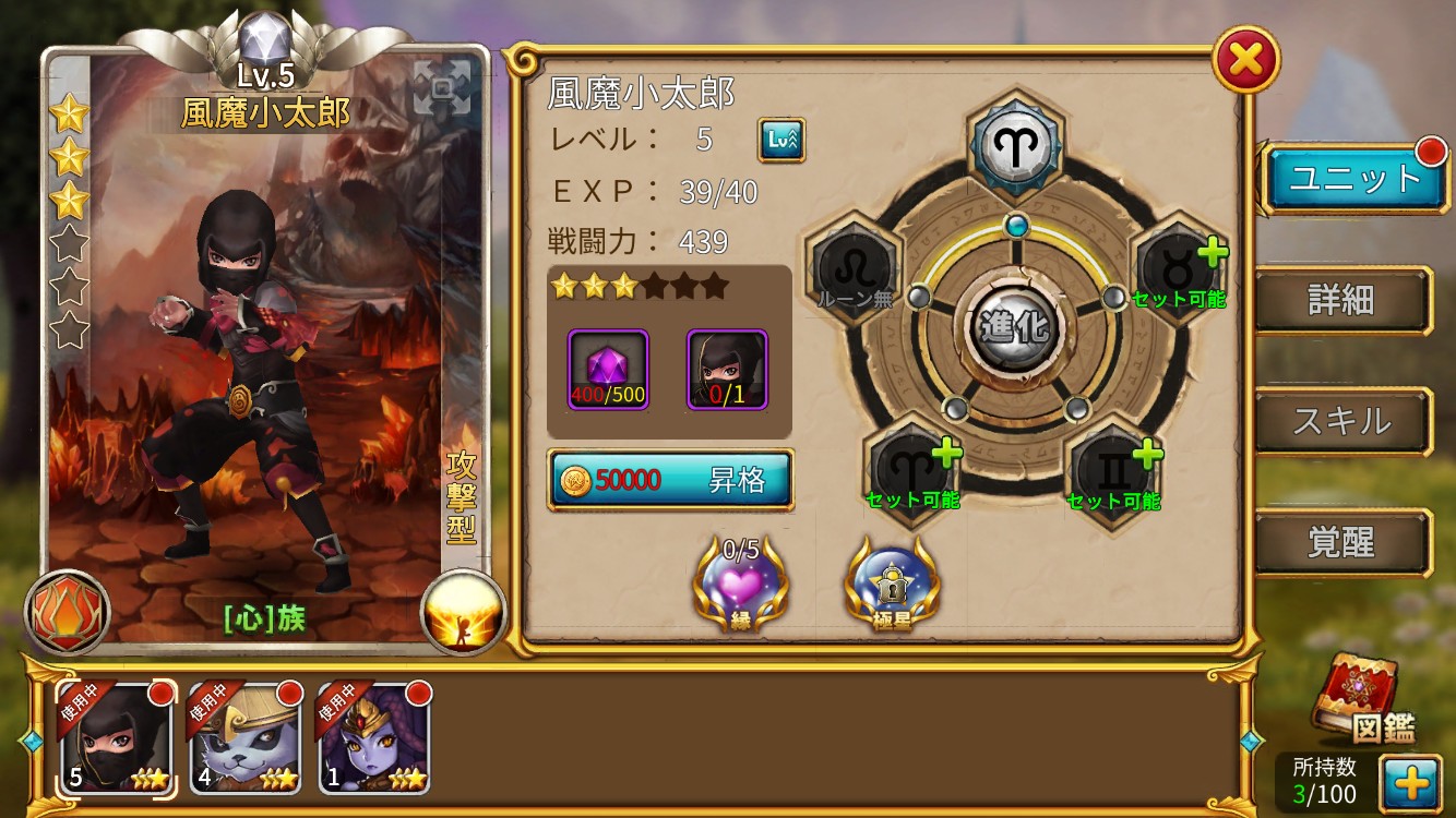 キャラクターにはそれぞれ属性があるので属性の特性を理解してユニットを編成しましょう。地は水に強く、水は火に強く、火は風に強く、風は地に強い。互いの属性の弱点となる属性を編成したり攻撃をすれば有利にバトルに勝利することができます。