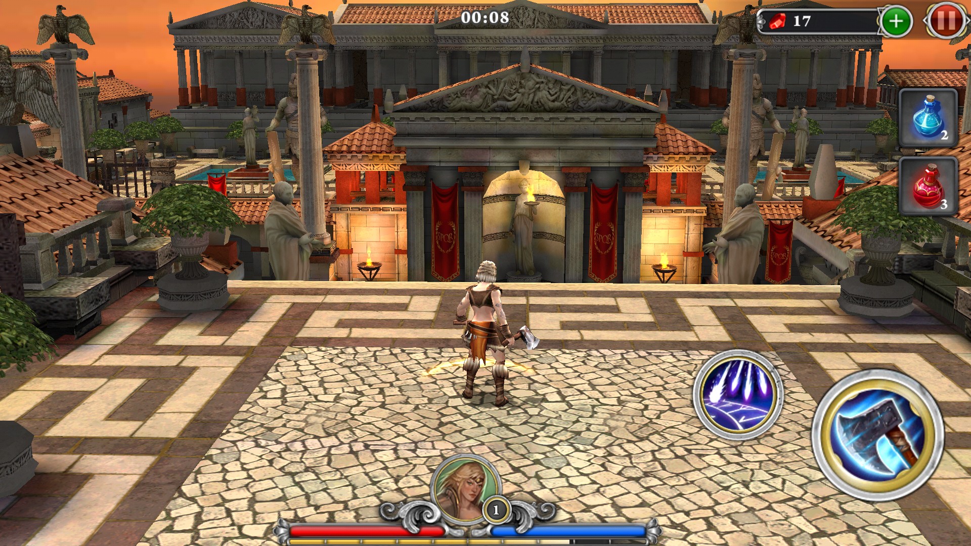 「ブラッド&グローリー」の時代設定は古代ローマ、プレイヤーは剣闘士となって戦の神アレスなどの敵対する神々たち戦います。襲ってくる敵たちを、味方してくれる神の加護を受けて撃退しましょう。