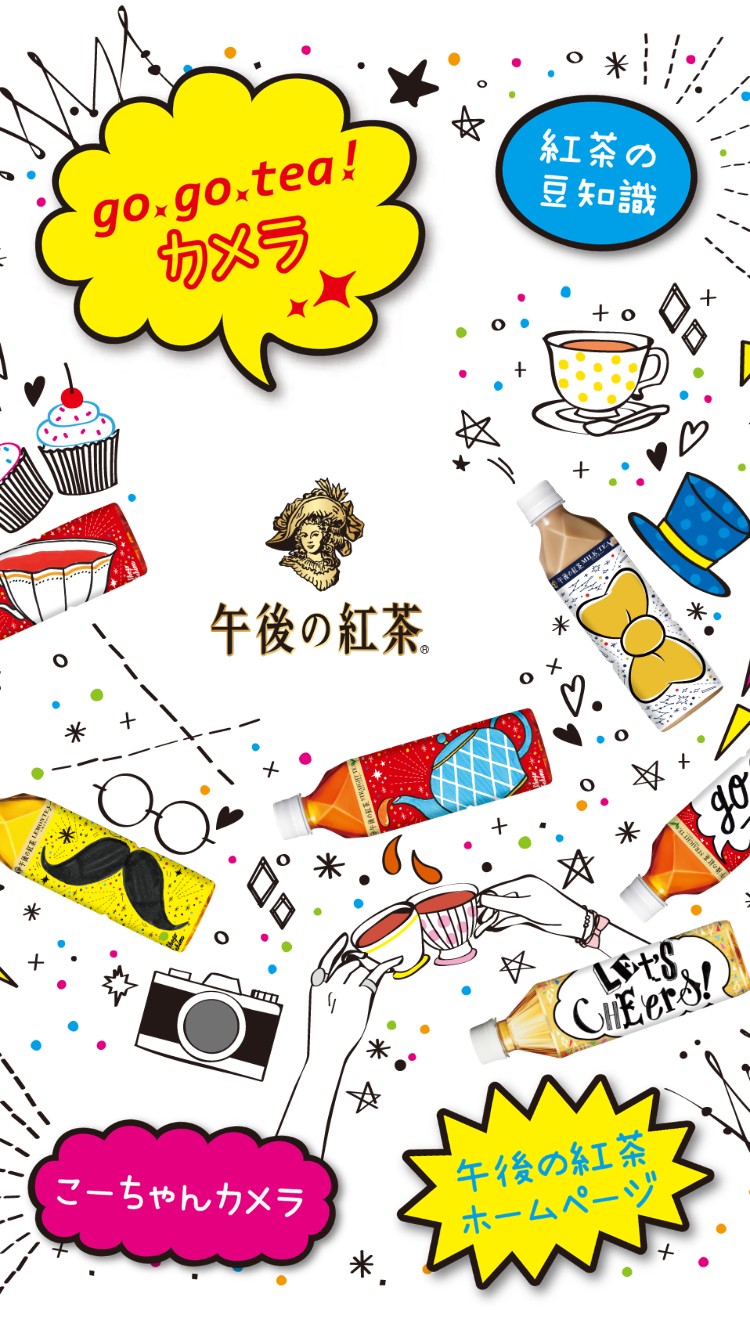アプリを立ち上げると、「go×go×tea!カメラ」「紅茶の豆知識」「こーちゃんカメラ」「午後の紅茶ホームページ」の4項目が選べる画面が表示されます。イラストがPOPでおしゃれなので、見ているだけでなんだか元気になりそうです。手書き風でサラッと簡単に描かれていそうですが、もちろん描けません。色使いや言葉などとっても素敵なんです。このイラストを描いているのは、関根正悟さんです。今人気のイラストレーターで企業やブランドから引っ張りだこなんです。SHIPSやROPE、ディズニーなど様々な場面で活躍されています。関根正悟さんはinstagramをやっておられます。気になる方は、ぜひチェックしてみてくださいね。
