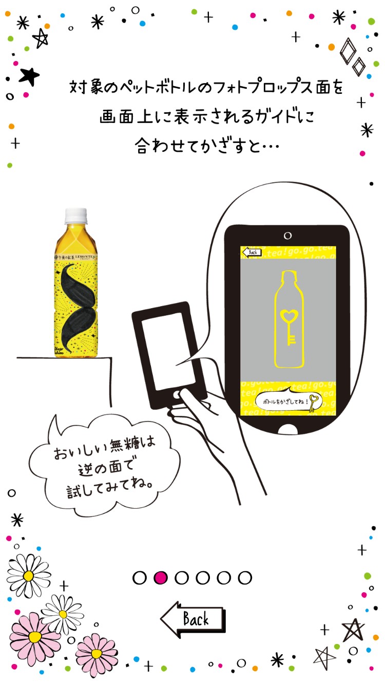 午後の紅茶、午後ティーをgo、go、teaと言い換えているネーミングにグッときました。さっそくボタンを押してみると、招待状と表示され、扉が開いたり閉じたりする画面が表示されます。扉をクリックしてみましょう。ボトルにハートのマークが入った絵とともに、写真が撮れるようになりました。対象のボトルをかざすと、午後の紅茶限定の華やかなフレームが現れて、静止画やアニメーションが撮影できちゃいます。ディズニーのキャラクター、ミッキーやマリーちゃんの可愛いフレームです。どのフレームも紅茶のイラストが入っています。大勢で楽しくワイワイと騒ぎながら撮るも良し、1人でまったりしながら撮るのもいいですね。撮った写真は、instagram、Twitter、LINE、Facebookに投稿することができますよ。(対象ボトルの販売が終了したため、