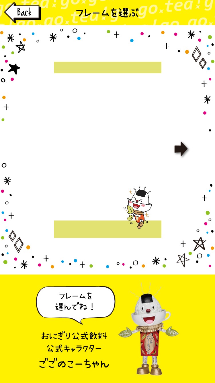 おにぎり公式飲料公式キャラクターのごごのこーちゃんのフレームで写真を撮ることができます。フレームは全部で3種類。