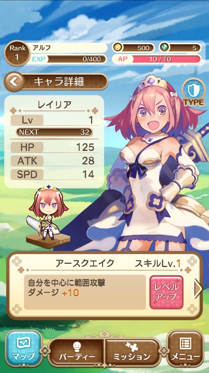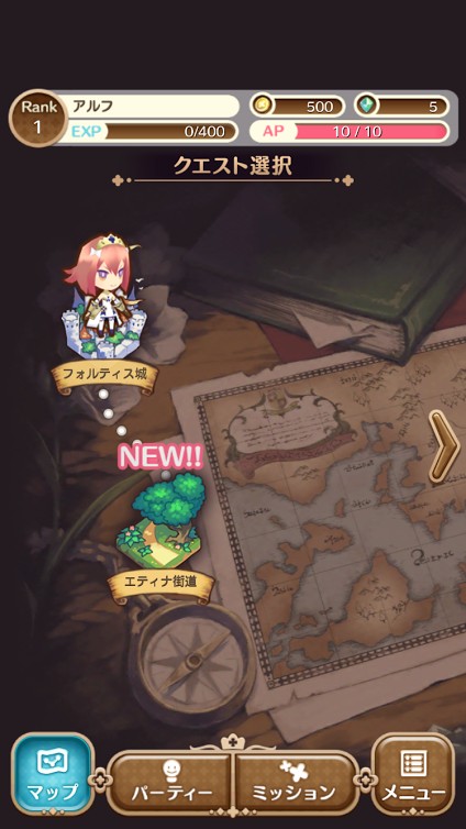 バトルゲームではホーム画面を見てみるとたくさんの要素が盛り込まれており、何から手を付けたらいいか、また初心者にとってはどのようにゲームを進めていけばいいのか悩んでしまいますが、戦姫物語ではパーティーを編成したりレベルを上げるパーティー画面と、クエストやある条件をクリアすると報酬がもらえるミッション画面の2つしかないのでとても見やすくシンプルなホーム画面となっています。よくあるガチャなどで強力なキャラクターを引かなくてもクエストを攻略することができます。