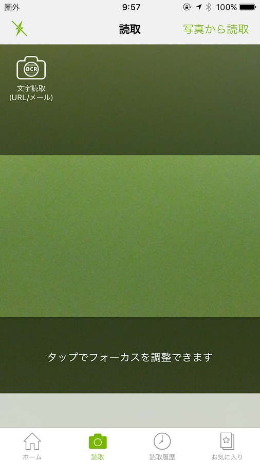 QRコード・バーコードを読み取りたい場合は、ホーム画面の左下に表示されるカメラマークの文字読取をタップします。