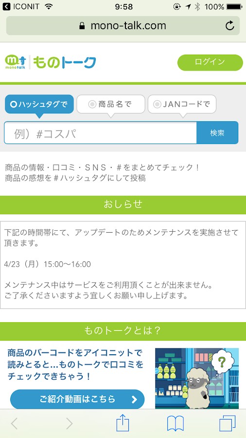 ものトークは、ハッシュタグ・商品名・JANコードを使って商品の情報や感想、または口コミまで簡単に検索することができる機能です。