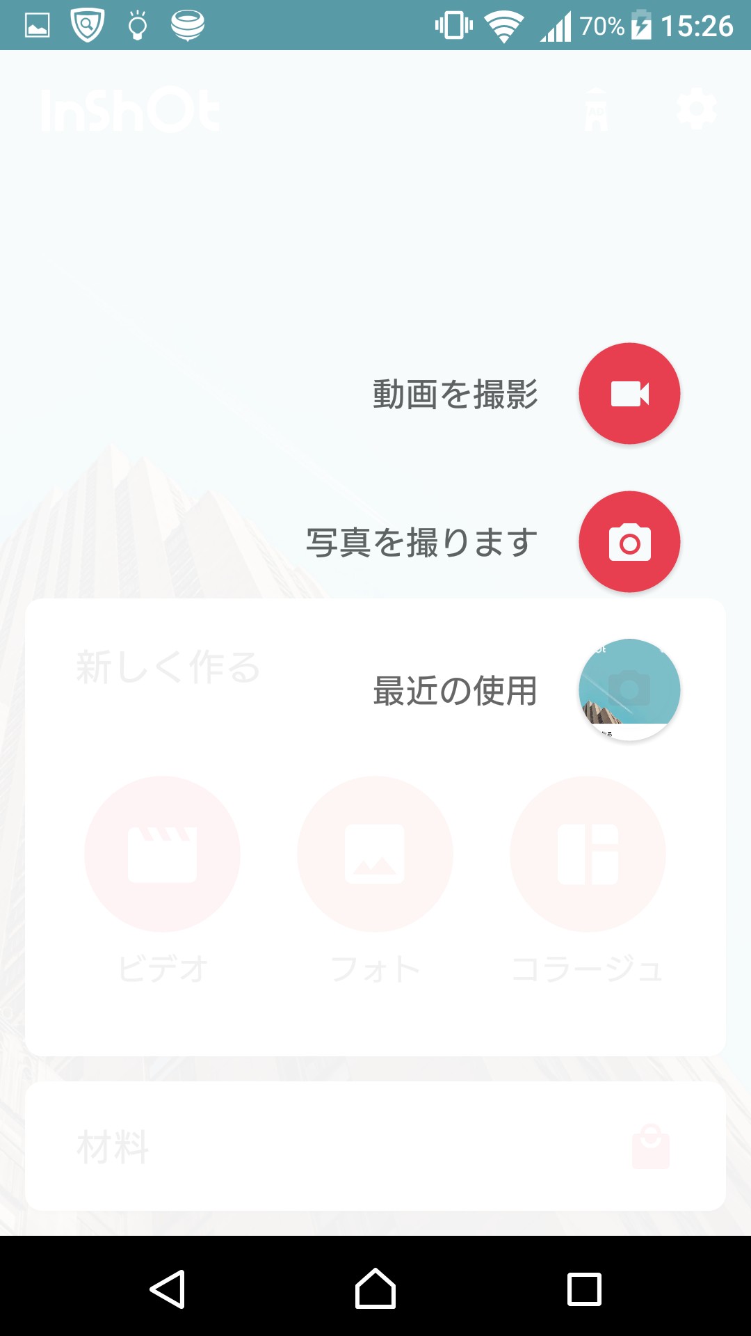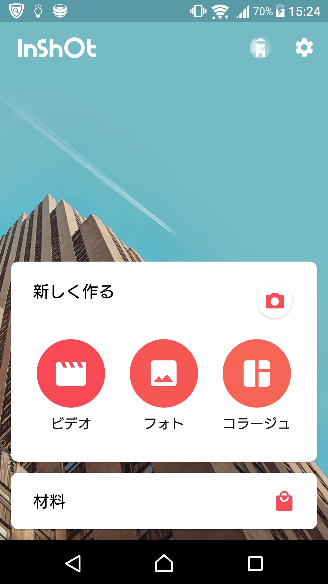 「InShot」を開くと、まずはビデオ・フォト・コラージュを選択する画面が出てきます。