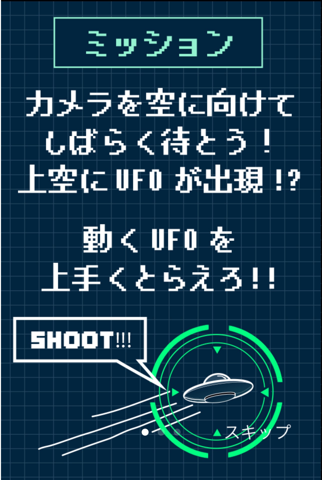 アプリを起動し、スタートボタンをタップすると、拡張現実(AR)上のどこかにUFOが出現します。飛行するUFOをスマートフォンのカメラで探し、シャッターボタンを押せば、あたかも偶然UFOが映り込んだような写真を撮影できます。
