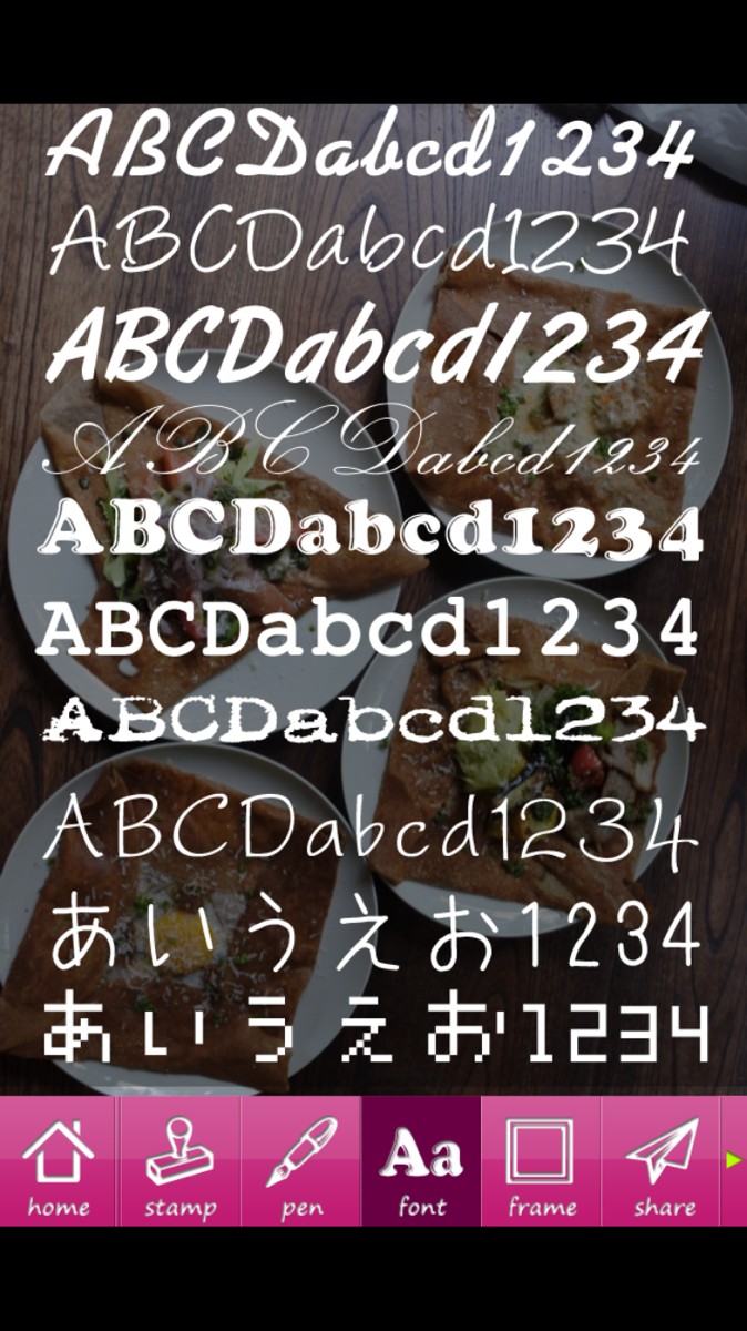 スタンプの拡大縮小や回転もできて、長押しすると削除もできます。フォントで文字を入れた場合も長押しすることで、色の選択、フォントの変更、削除が可能です。これでお気に入りに仕上がった写真を共有機能を使って、みんなに自慢しちゃいましょう。