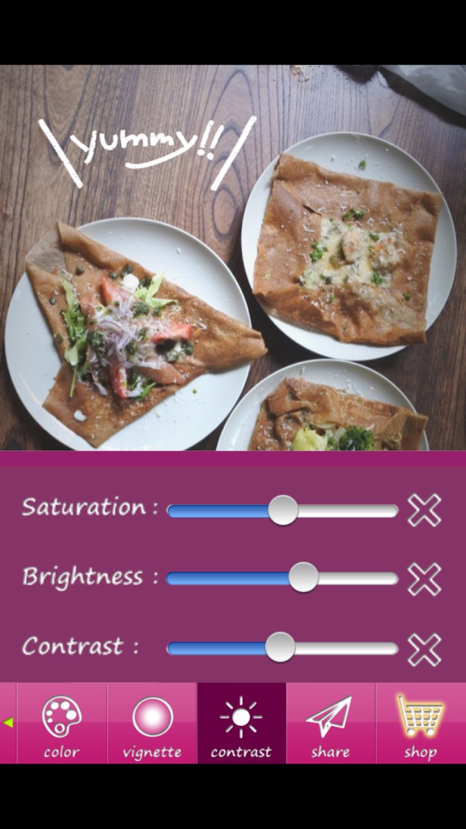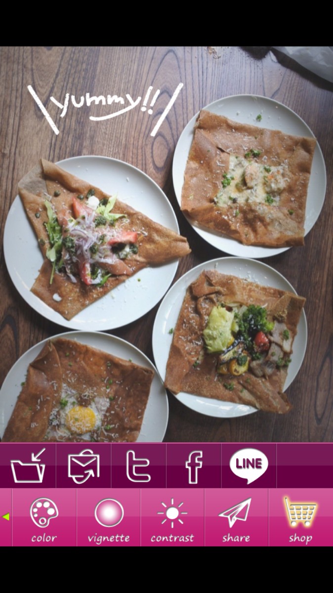・そこで下にいくつかのアイコンが表示されるので、お好みのスタンプやペンでデコったり、colorやvignette、contrastで画像加工を行います