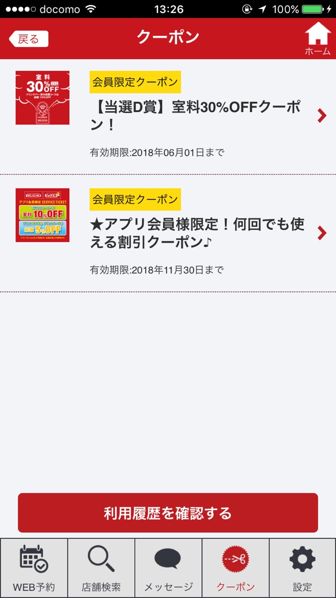 アプリ限定のクーポンを使うには、画面右下の「クーポン」ボタンを押します。クーポンのカテゴリを開いたら、現在使用できるクーポンが一覧で表示されるので、使用したいクーポンを選択しましょう。クーポンを開くと画面一番下に「このクーポンを使う」ボタンがあります。そのボタンは利用する際にスタッフの目の前で押す必要があるので、注意してください。