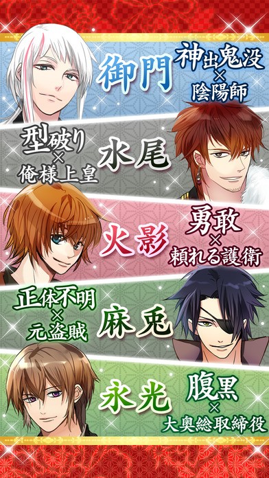 江戸城であなたの世話役になる手厳しい春日局をはじめ、俺様キャラの正室候補の鷹司、冷酷な湯殿係の夏津、腹黒い大奥総取締役の永光、幼馴染の庄吾など、