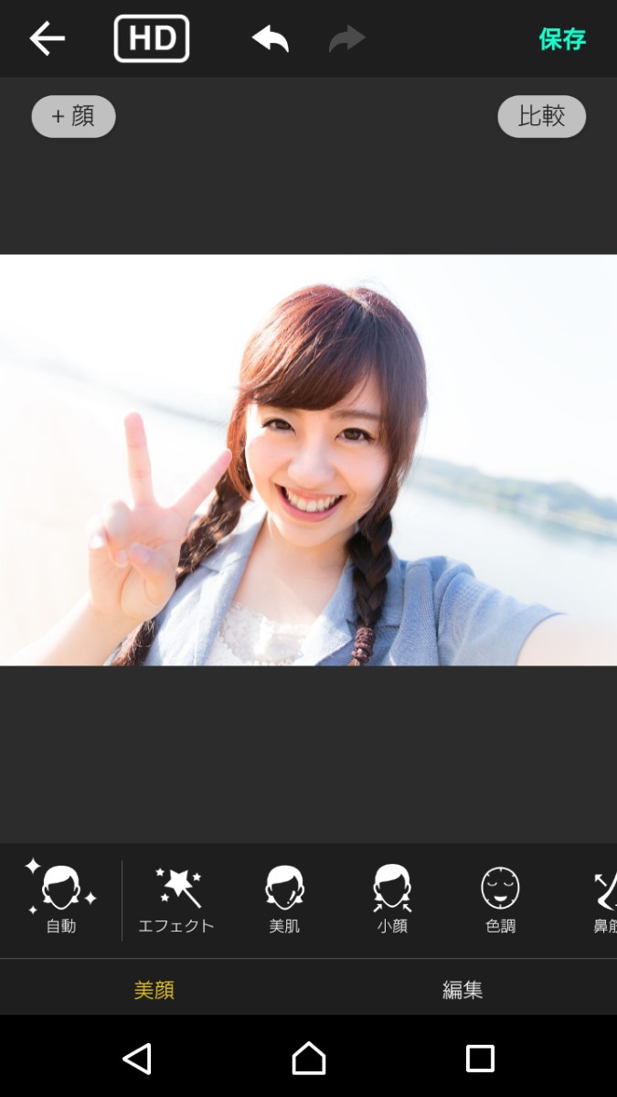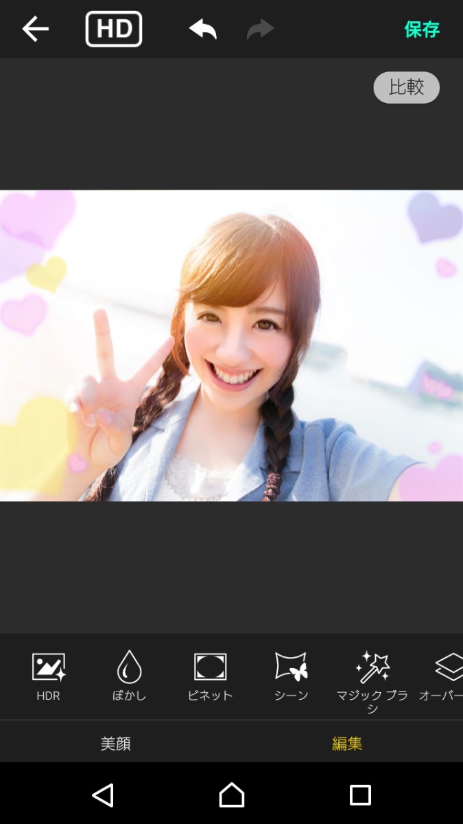 画面右上の「比較」ボタンで、加工前、後の写真を比較することができます。加工する機能が多く、こだわった加工ができるので自分の理想とする写真に仕上げることができます。