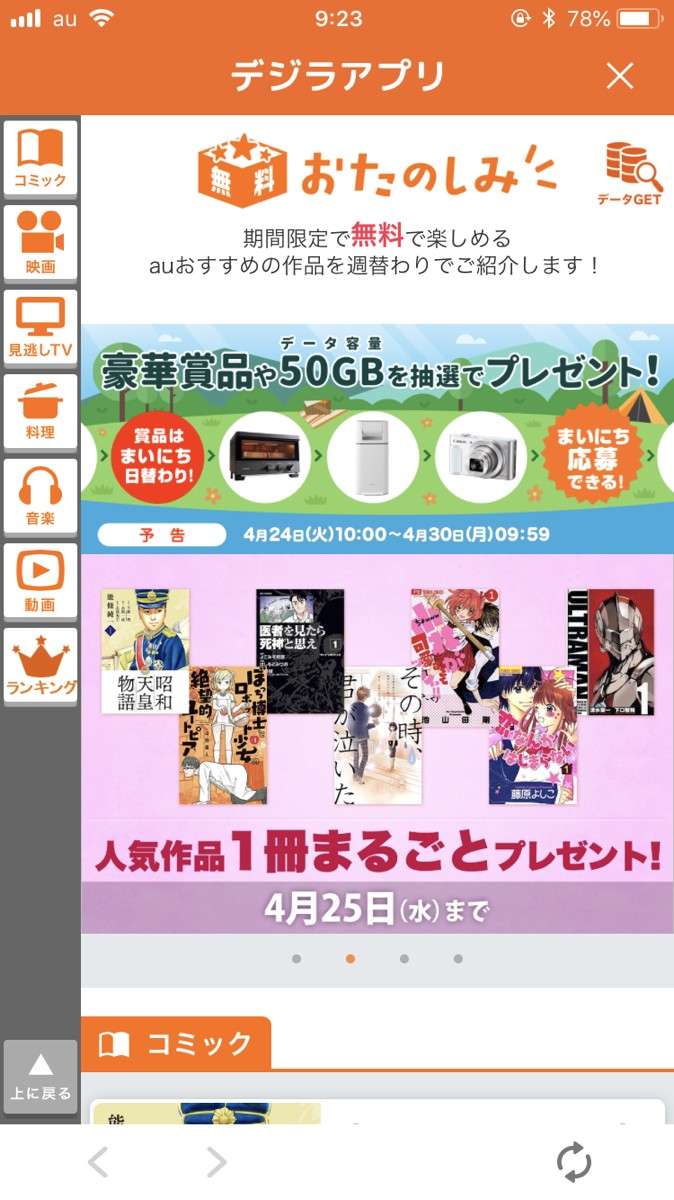 アプリ内のメニューにある「おたのしみ」アイコンをタップしてみましょう。この機能では期間限定で映画・アニメ・コミックやドラマなどのコンテンツを無料で楽しむことができます。コンテンツの内容は週替わりで変更されるのでこまめなチェックがおすすめです。コンテンツの中には有料コンテンツも含まれます。