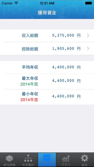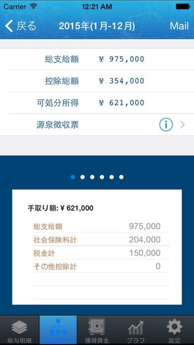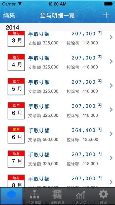 給与明細記録機能は、毎月の給与明細、賞与、一時金、ボーナスなどの収入、税金、社会保険料などの記録ができます。