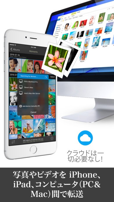 このように、位置情報から自動的にバックアップするのもとても便利ですが、PhotoSyncには、特定の写真だけをパソコンに転送する機能もあります。まず、パソコン側でクライアントソフトを起動し、「Transfers to:Folder」を選んでおきます。次にiPhone側で、転送したい写真を選びます。写真を選び終わったら、右上の赤いアイコン(同期アイコン)をタップします。転送する写真の指定画面が開くので、「Selected」をタップします。転送先には「Computer」を選んで、パソコンを指定すれば、一瞬でパソコンに写真が転送されます。