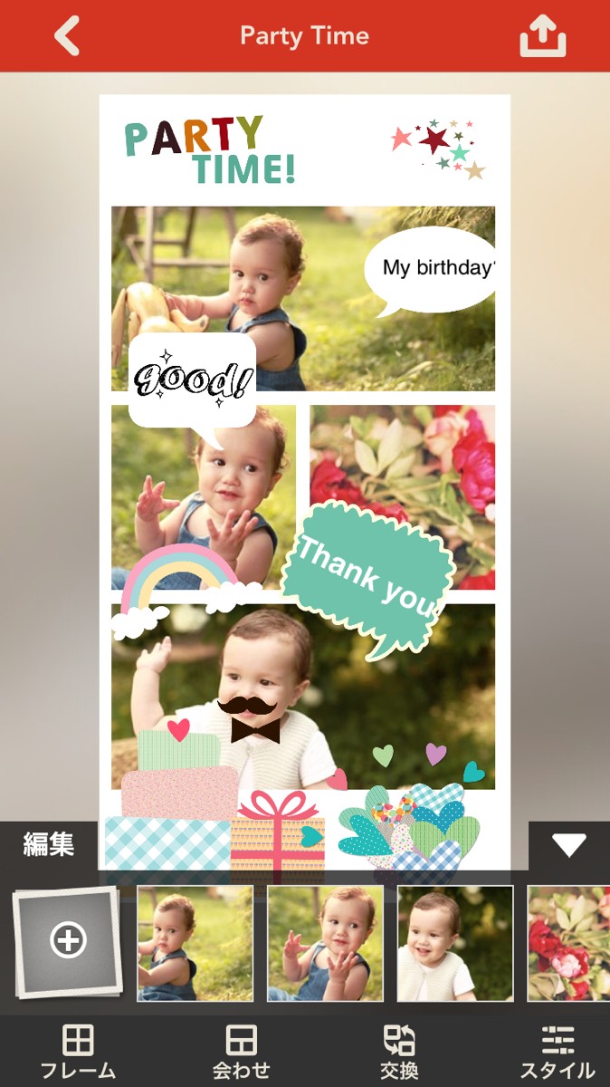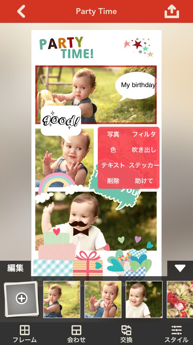 「スタイル」を選択すると、フレームの色や背景が変えられます。枠の太さや形も調整できるので色々試してみてください。操作が分からなくなってもメニューの「助けて」を選ぶとヘルプが表示されるので安心ですよね。