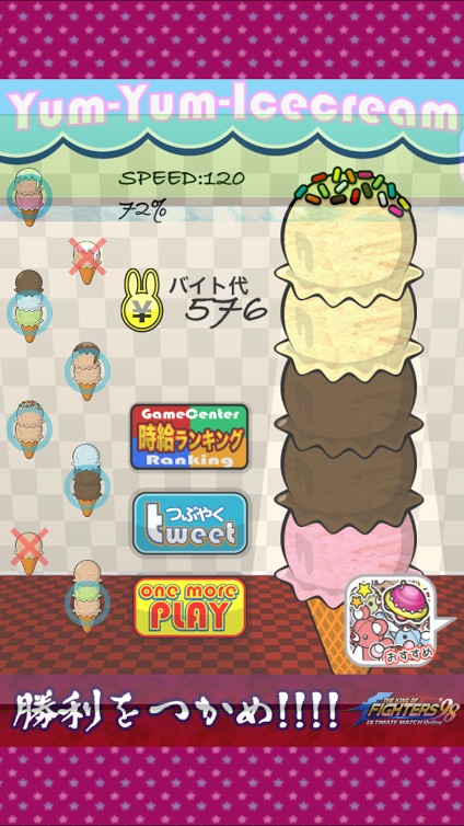 3タッチアイスクリームではGame Centerに対応しているので、全国の人とスコアを競うことができます。全国の人と競い合うのは時給です。アイスクリームをパーフェクトにしかから順に積み重ねてこう時給を目指しましょう。あなたは全国で何番目になれるのか?トップを目指してチャレンジしてくださいね。さらに、3タッチアイスクリームはツイッターにつぶやくことができるので、高時給が出た時はお友達に自慢したり、全国の人に自慢することもできます。アイスは成績に応じて豪華になるので可愛いお気に入りのアイスクリームができたらツイッターに投稿するのもおすすめです。