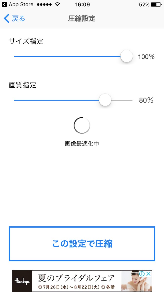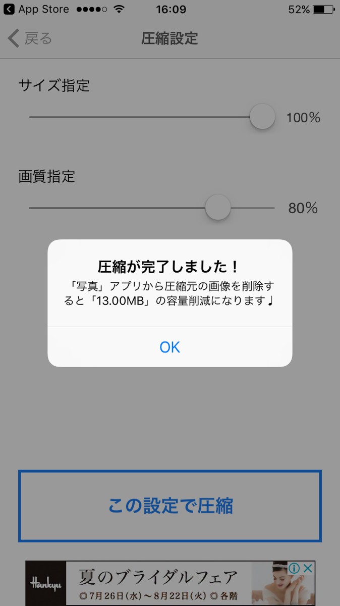 以上です。圧縮が完了すると、iphoneのカメラロールから圧縮元の画像を削除するとどれくらいの容量が削減できるかを詳しく数字で知らせてくれるので分かりやすくて嬉しいアプリです!