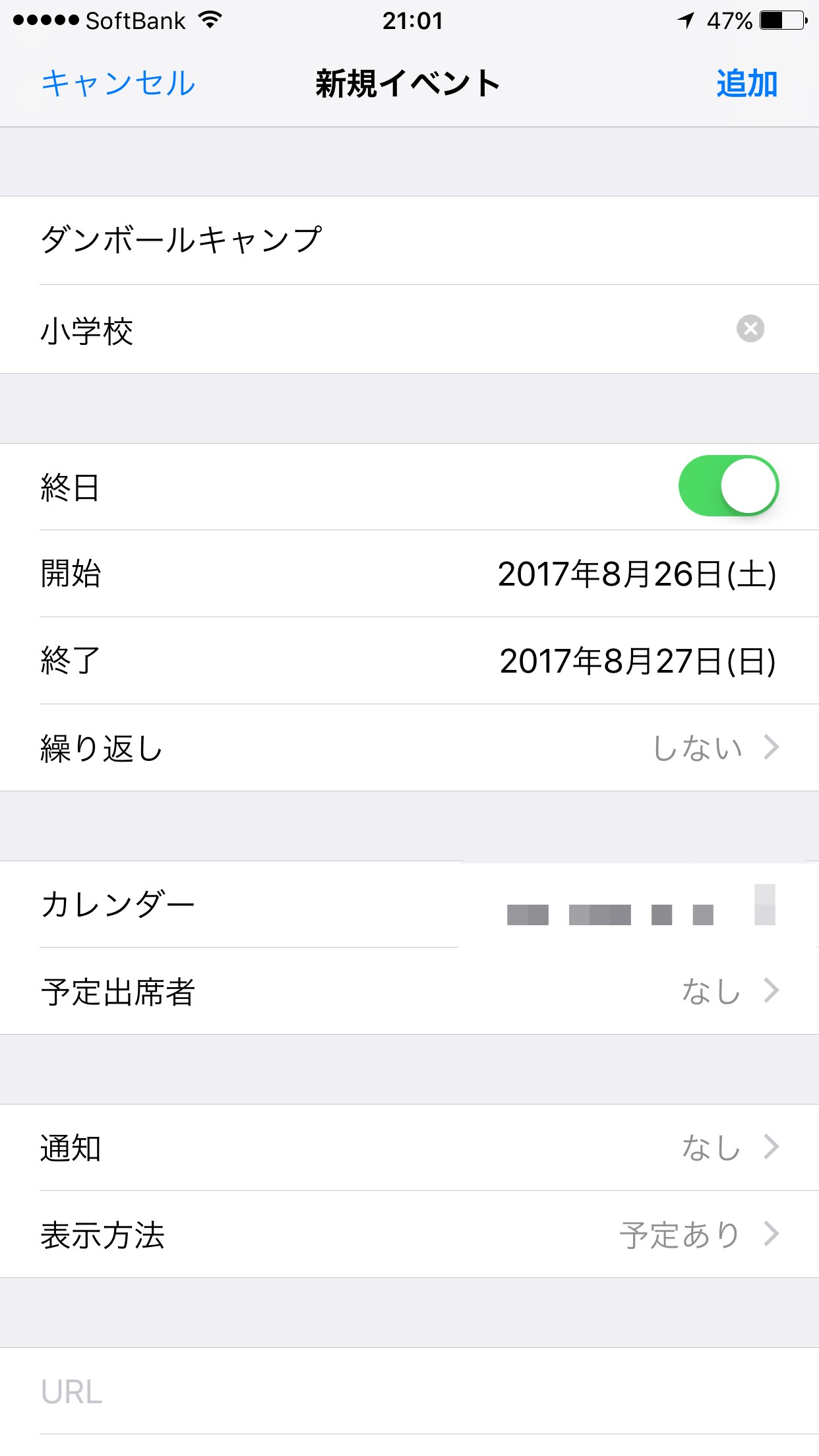 手順3.スケジュール情報を入力し、画面右上の「追加」ボタンをタップ