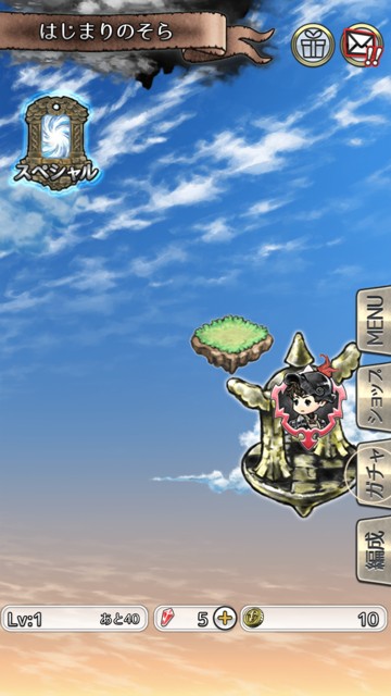 ステージ画面には、プカプカと小さな島が浮かんでいて島をタップするとステージがスタートします。上の方には巨大な雲がありボスが隠れています。