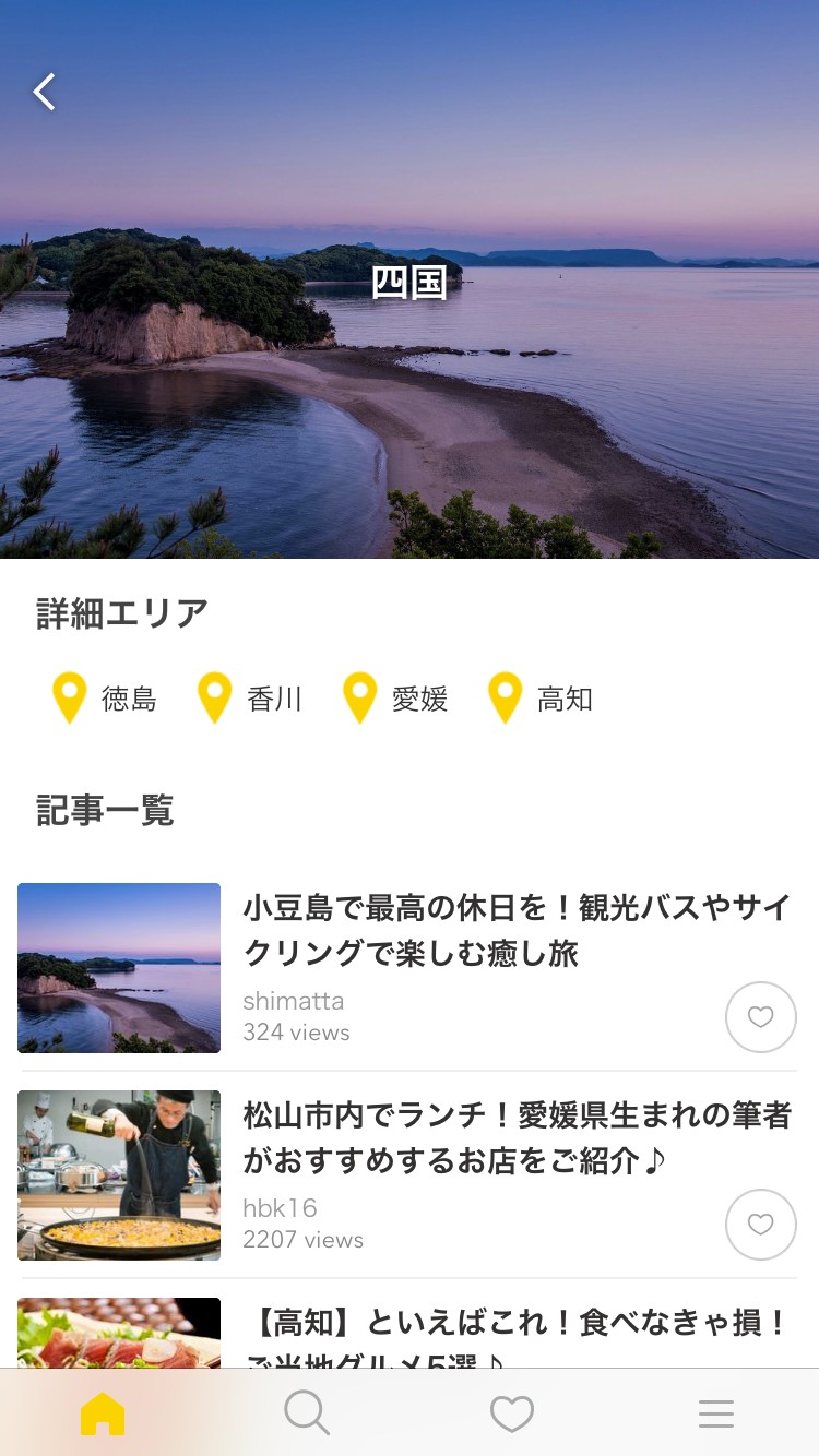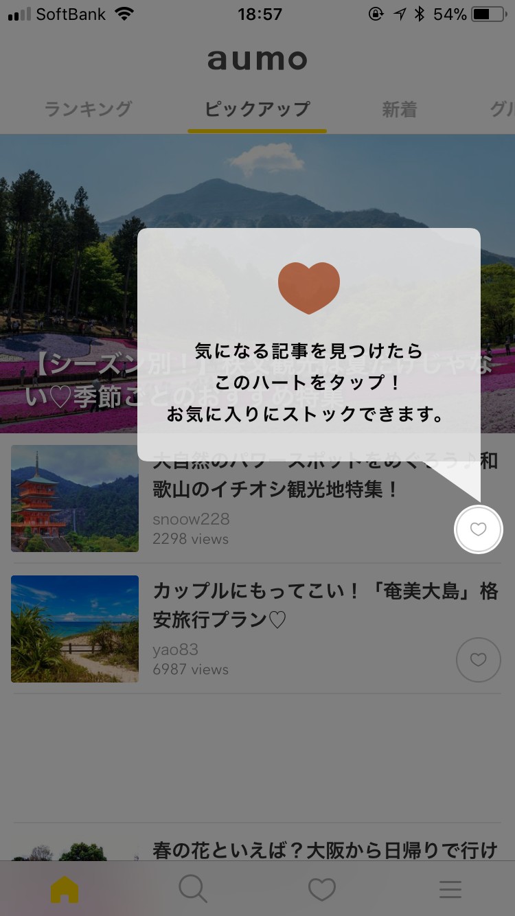 気に入った記事や写真は右下のハートマークをタップ。ピンクに色が変わったらお気に入りに保存完了です。今すぐは行けないけどいつか行きたいと思った場所などをクリッピングしておけば、自分だけの旅行雑誌ができ上がり!いざ旅行に行こう、という時にお気に入りから探せばすぐに行き先が決まりそうです。
