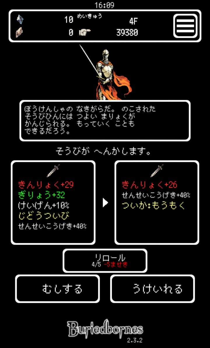 武具を入手した時の性能は、一定回数リロールすることで変化させることができ、より強いアイテムがでることもあれば、弱いアイテムが出てしまうこともあります。