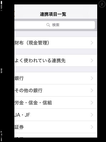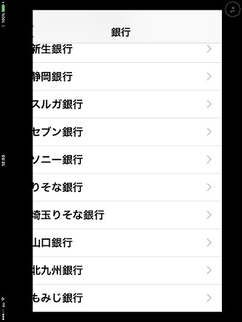 その後、連携項目一覧画面の銀行ボタンをタップすると銀行の種類が表示されるので該当の銀行を選択すれば終了です。