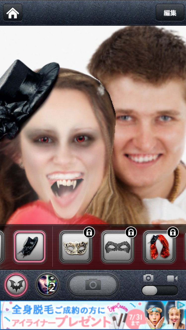 不気味に表情を変える吸血鬼に変身できました。今回はカップルの写真を使ったので、恐ろしさも倍増です。複数人で撮影した写真を使うと、吸血鬼が襲っているような状況を作り出すので、ぜひ友達同士で使ってみてくださいね!