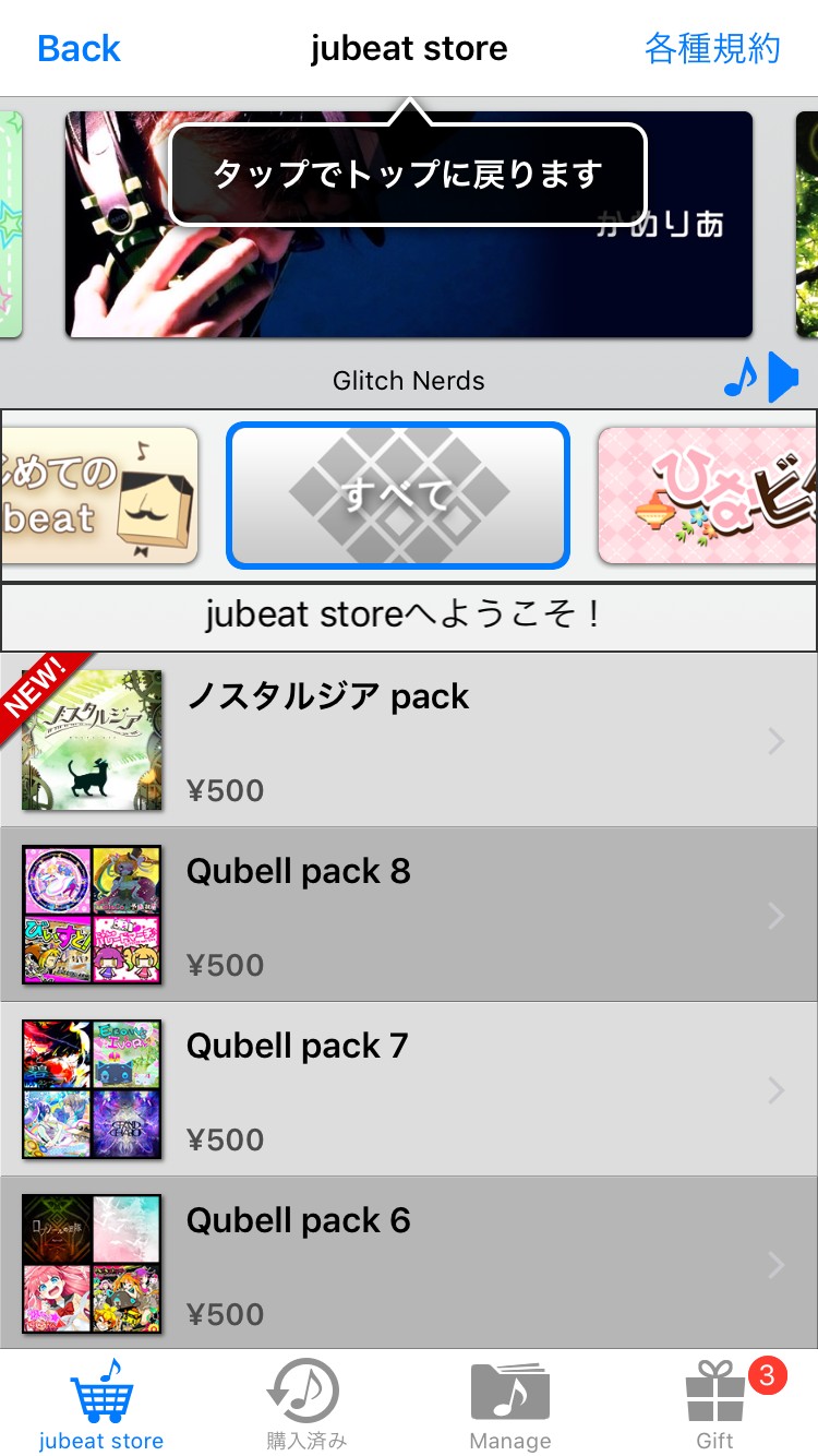 jubeat plusでは様々な楽曲でゲームを楽しむことができます。無料でゲームを始めると、最初から入っている楽曲は、4曲程です。その他にも違う曲でゲームを楽しみたい場合には、アプリ上部の右上、音符マークをタッチしてみましょう。jubeat store にて様々な楽曲を購入することができますよ。楽曲が、パックになっていて¥500より購入できます。また、jubeat storeのアプリ右下にプレゼントマークをタッチすると、無料や条件付きで新しい楽曲やマーカーをゲットすることができます。