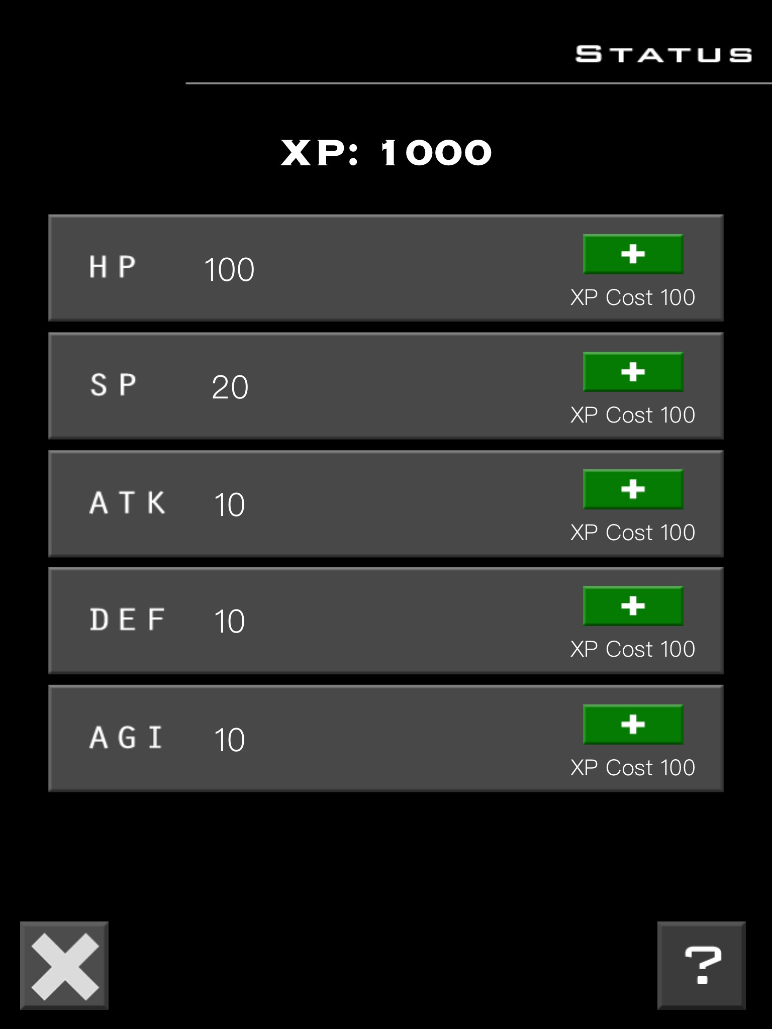 ステータスはHP・SP(スキルの使用)・ATK(敵に与えるダメージ)・DEF(防御力)・AGI(命中・回避)の5つで一定のXPをつぎ込むと1ポイント増え、