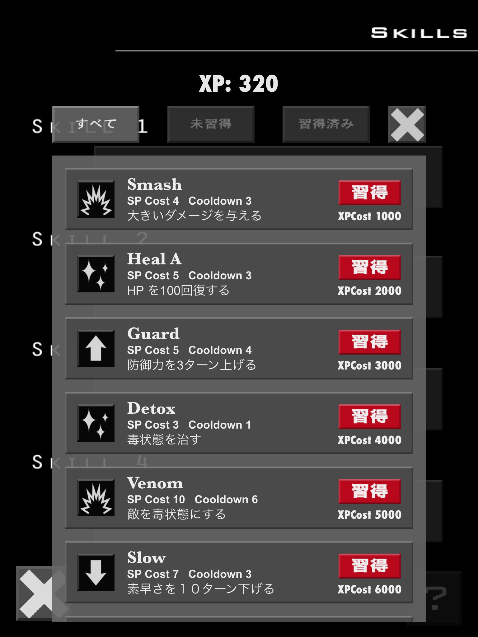 覚えようと思えば序盤でも強力なスキルを覚えられます。まずは単体にダメージを与える「Smash」を習得してください。そして1ターンで確実に倒せる敵を見つけられると効率が良いです。