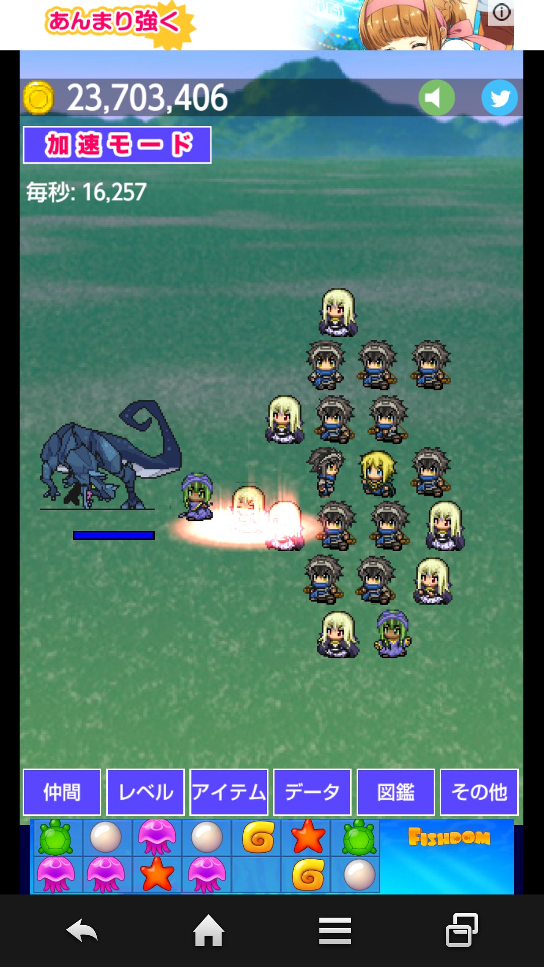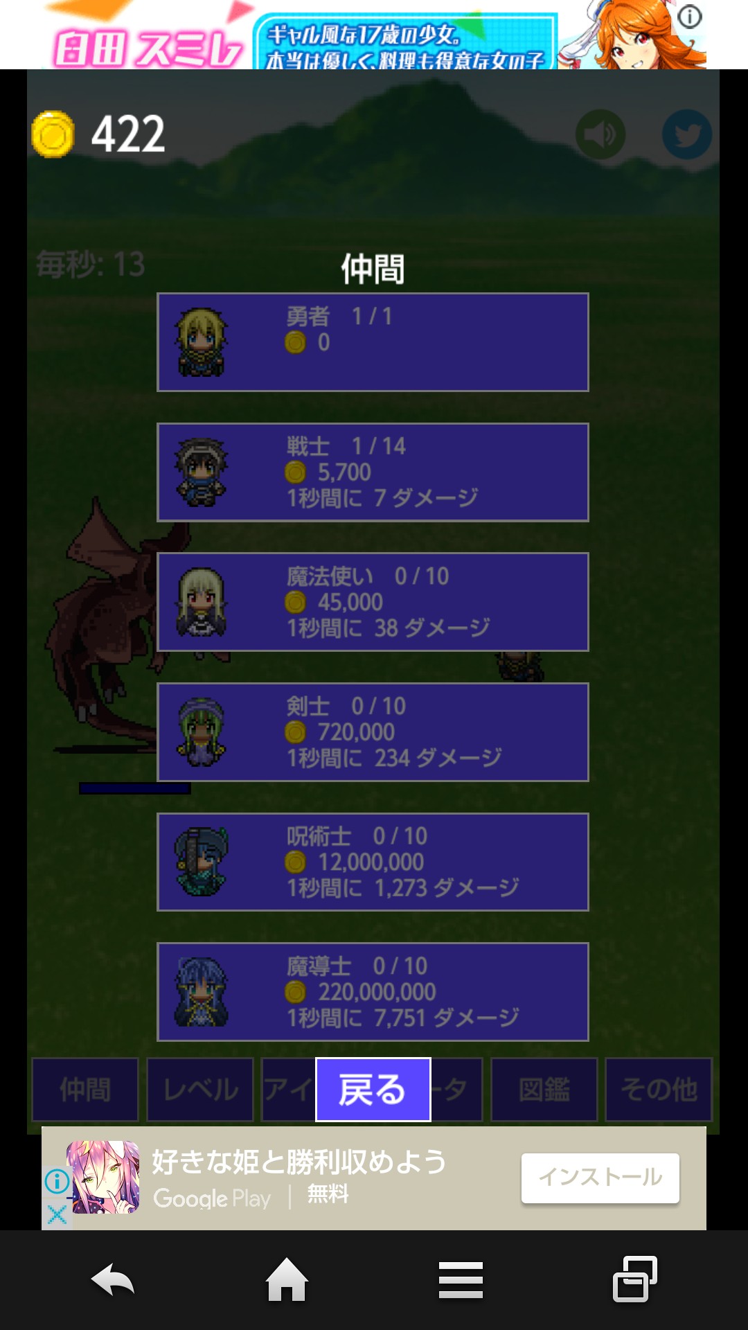攻撃力を上げるとゴールドもどんどん溜まり、より仲間達を増強する事ができます。仲間もモンスター図鑑もいつでもチェック出来るのでコンプリートを目指すとやりがいもUP!