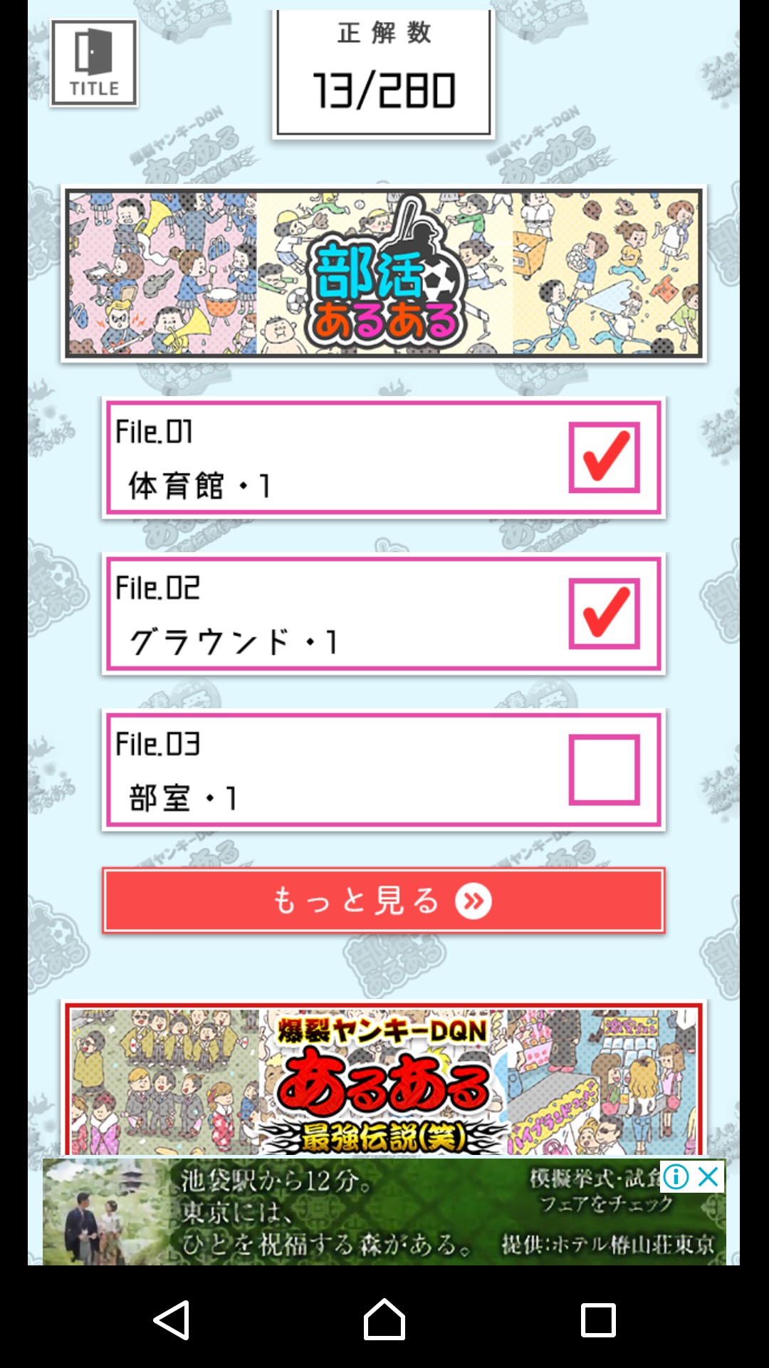 File.01の体育館・1から順に問題を解いていきます。File.01の中に、さらにQuestion.01から04まで問題が分かれています。答えを示す文章が出てくるので、それを基に解いていきましょう。解答の仕方はいたってシンプル。該当箇所をタップしたら決定ボタンをタップするだけです。見事正解することができたら、「正解」という文字が現れ、次の問題へと進むことができます。反対に、不正解であれば、「不正解」という文字が現れ、リトライをタップすることで再挑戦することが可能です。リトライは何度でもOK!答えを探し当てていきましょう。降参する場合は、「答えを見る」から解答を見ることができ、次の問題へ進むことができます。