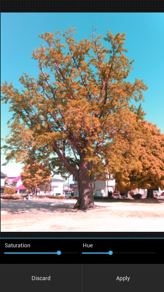 「PicShop Lite - Photo Editor」使ってみました。まずアプリを立ち上げると画面左下をタップします。「Camera」「Gallery」「Facebook」から画像を選びます。画面が何だか暗いけど、画面をもう一度タップすると画像がちゃんと出てきました。「Edits」をタップして加工していきます。色合いや彩度など加工したい項目を選びます。迷ったら色々試してみてください。やっていくうちにイメージが湧いてきます。今回は色も変えてみます。緑の葉っぱが一気に色づいて秋のような雰囲気になりました。「Apply」をタップして決定します。他に加工がなければ画面右下の矢印をタップでできあがります。「Save」か「Share」を選択します。今回は「Save」で保存しようと思います。画面下を横にスライドさせると、メールやFacebookやインスタグラムでシェアすることもできます。サイズを選択したら「OK 」です。自分のスマホに保存されるから、アプリを起動しなくても確認できます。