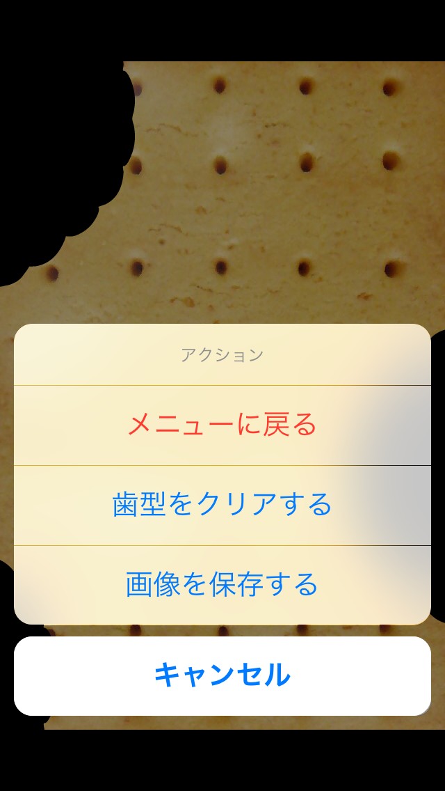 ・写真の右半分をタップすると、写真を右からかぶりついたような歯形がつき、写真の左半分をタップすると、写真を左からかぶりついたような歯形がつく。