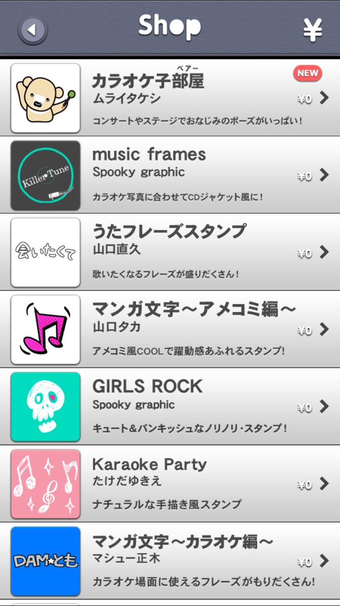 ・下に表示される「スタンプ」のアイコンをタップして、「shop」を選択すると、無料のスタンプやフレームのリストが表示されるので、使用したいものをダウンロード。1度ダウンロードしたものは「shop」マークの横に表示されます