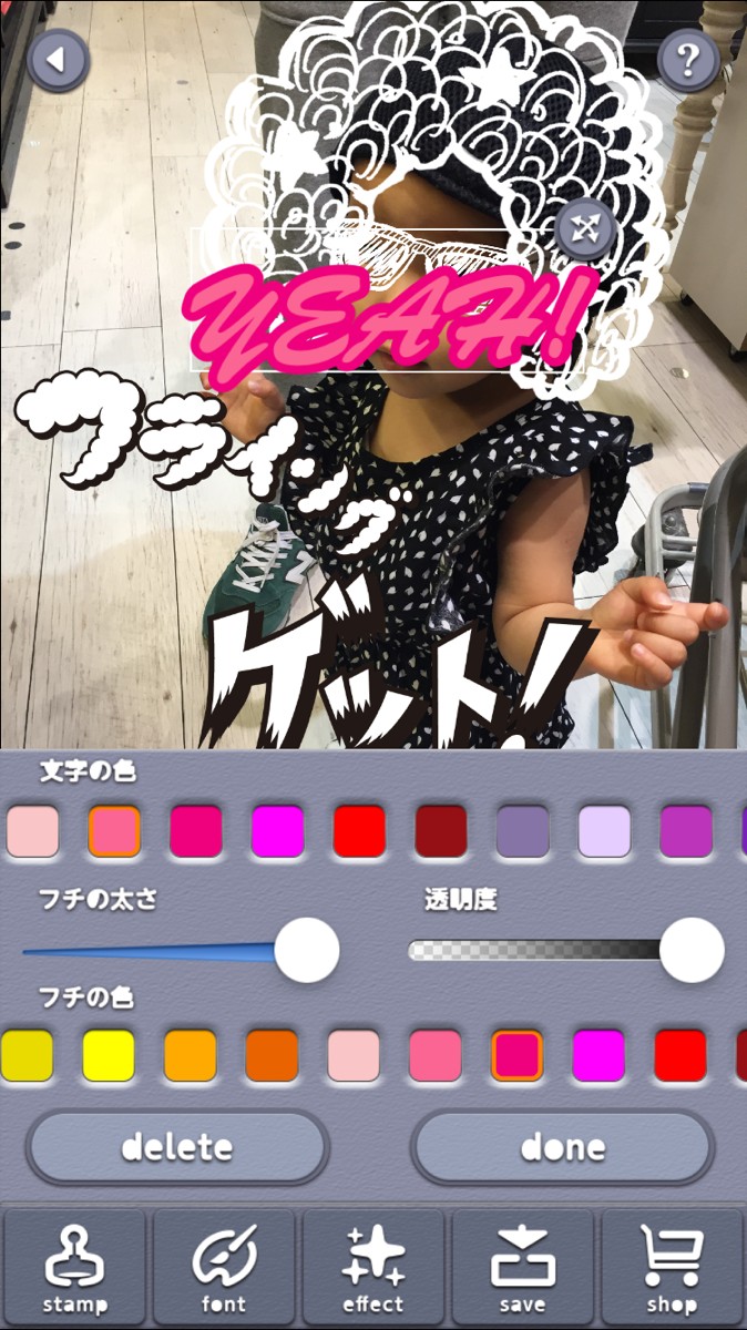 これで完成です!スタンプは大きさと角度を1本の指でスライドするだけで調整が可能。フォントも入力すると、文字の色やフチの色が表示され、フチの太さや透明度も指1本で選択ができるようになっています。面倒な操作はなく、手軽に写真の加工をすることができますよ。