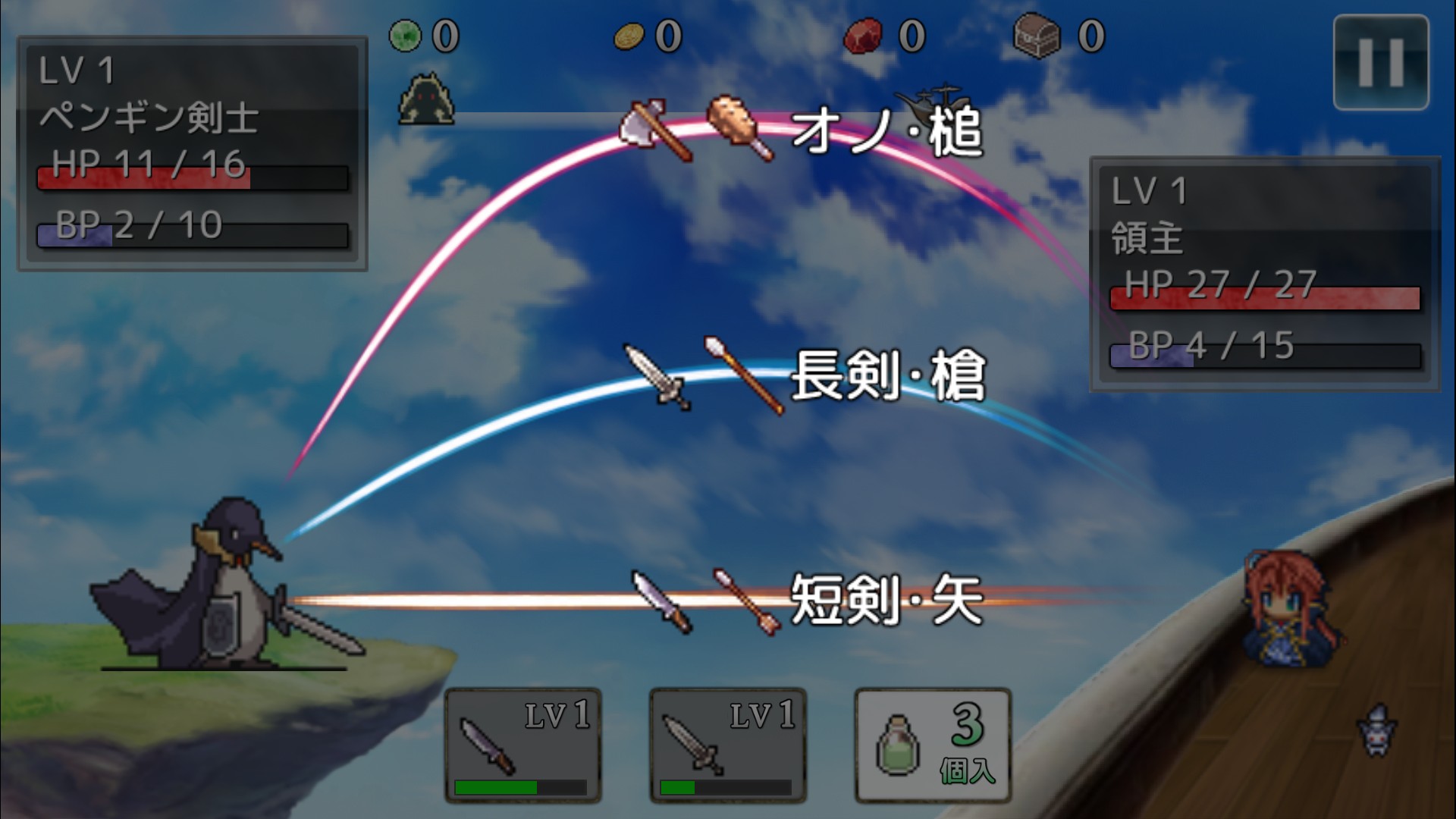 装備枠は全部で3つです。これは、「武器」「防具」「アイテム」のすべてに共通です。どの高さの武器にも対応できるよう三種類の高さの武器を装備するか、防御力を重視するか、回復アイテムを持つかは作戦次第です。特にプレイヤーレベルの低いうちは、回復アイテムを使うことが多いでしょう。回復アイテムで貴重な装備のスロットを使いたくないという場合は、まず武器レベルを上げて奥義を会得し、プレイヤーレベルを上げてHPを高めてから、上級のステージに臨むといいでしょう。